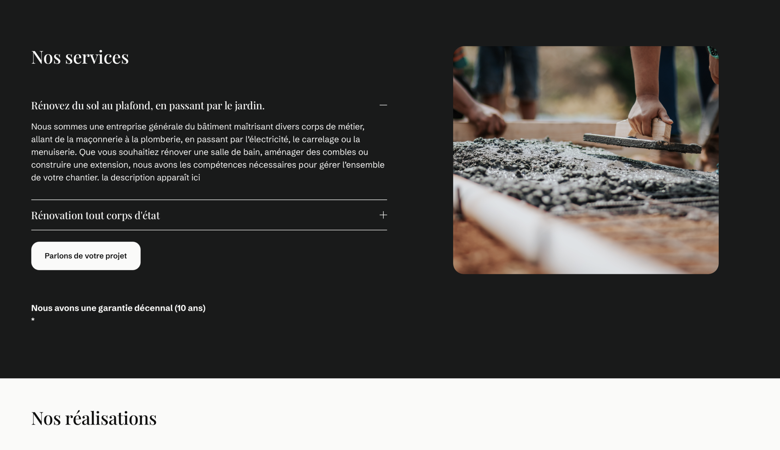 Conception d’un site vitrine pour une entreprise de rénovation dans le secteur du BTP, permettant de présenter ses prestations, ses projets réalisés et ses coordonnées. Le site a été pensé pour refléter le savoir-faire de l’entreprise tout en offrant une expérience claire et professionnelle aux visiteurs.